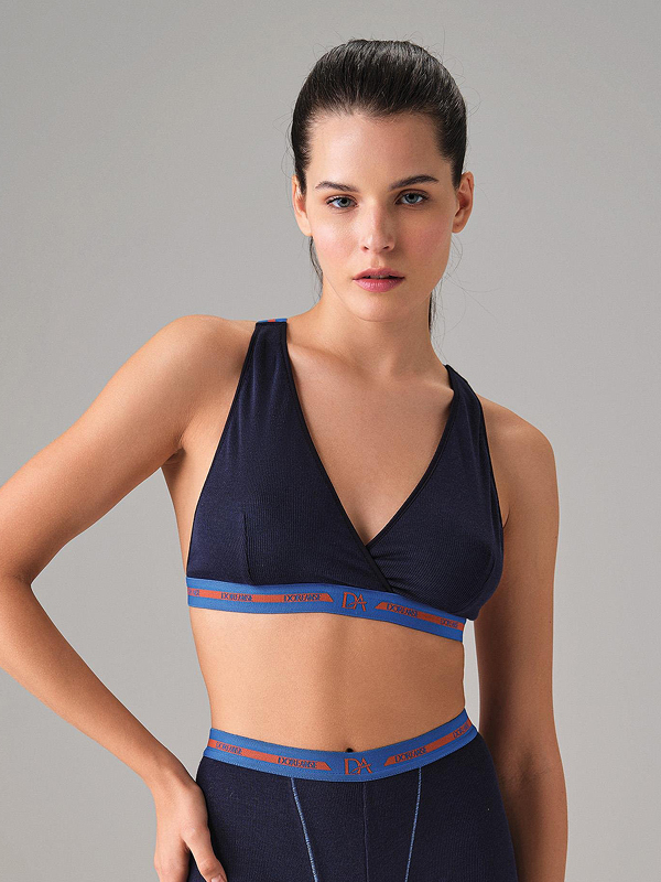 Описание: Трикотажный бюстгальтер без чашечек тёмно-синего цвета в спортивном стиле из удивительно мягкого и эластичного натурального материала - микромодала с фактурой в мелкий рубчик.
