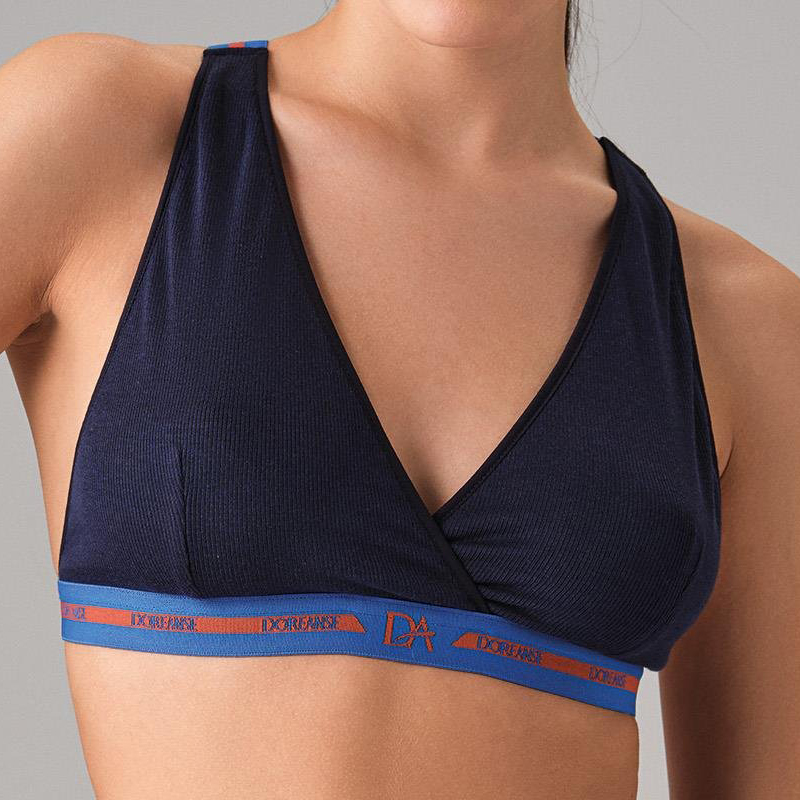 Под грудью и на спинке контрастная синяя резинка с фирменным логотипом бренда «DOREANSE».