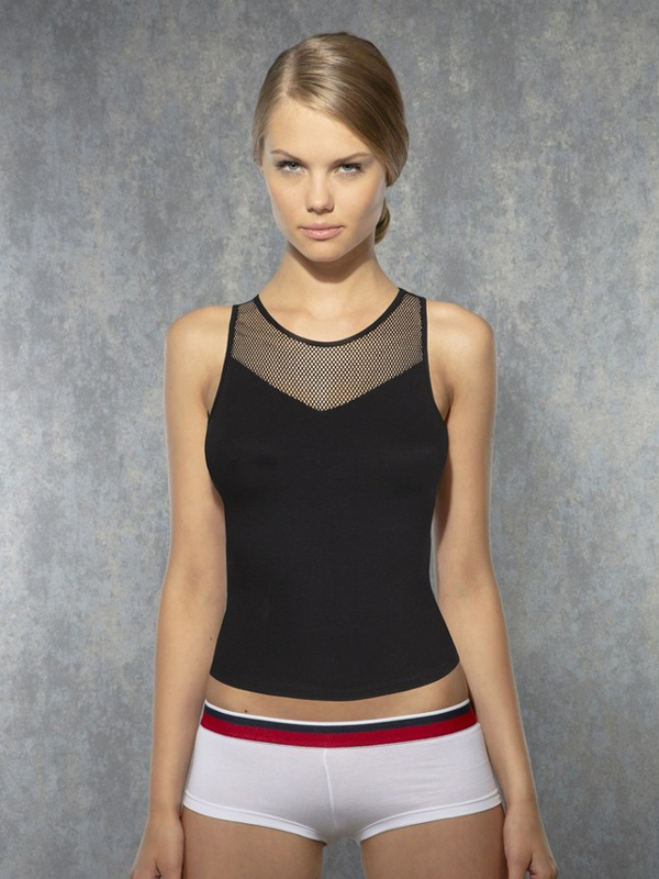Описание: Элегантная женская слегка укороченная майка-топ чёрного цвета с сетчатой вставкой на груди.
