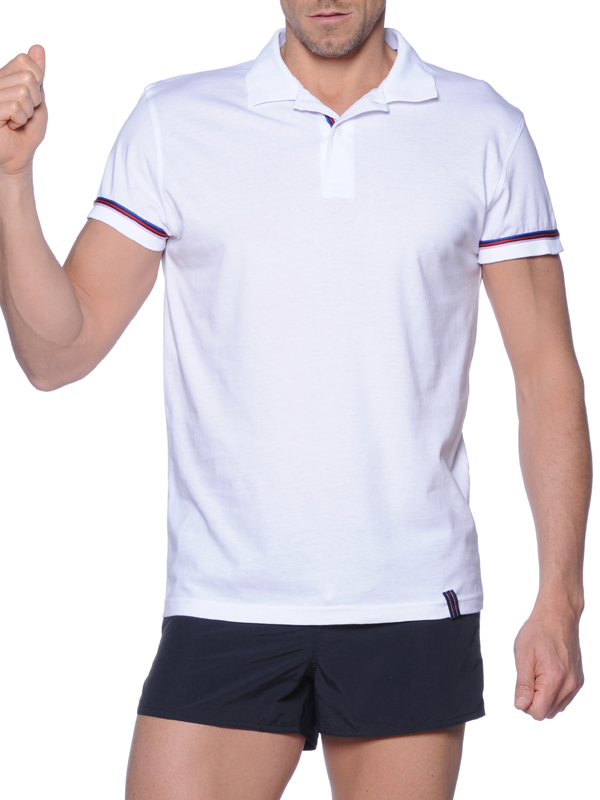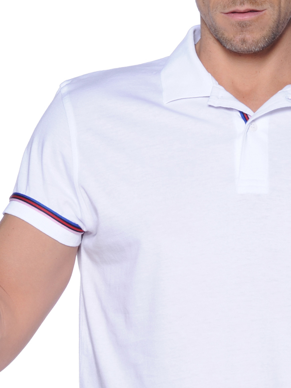 Описание: Классическая мужская рубашка-поло от «HOM» белого цвета с отделкой цветным кантом на рукавах и воротнике.