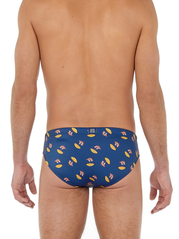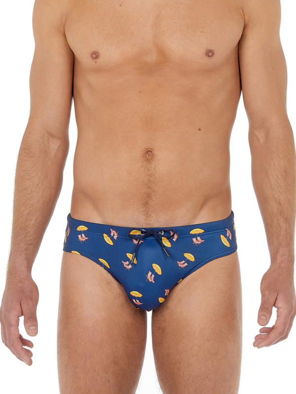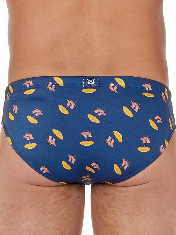 Описание: Мужские пляжные плавки-брифы от «HOM» тёмно-синего цвета с принтом в виде пляжных зонтиков и шезлонгов.