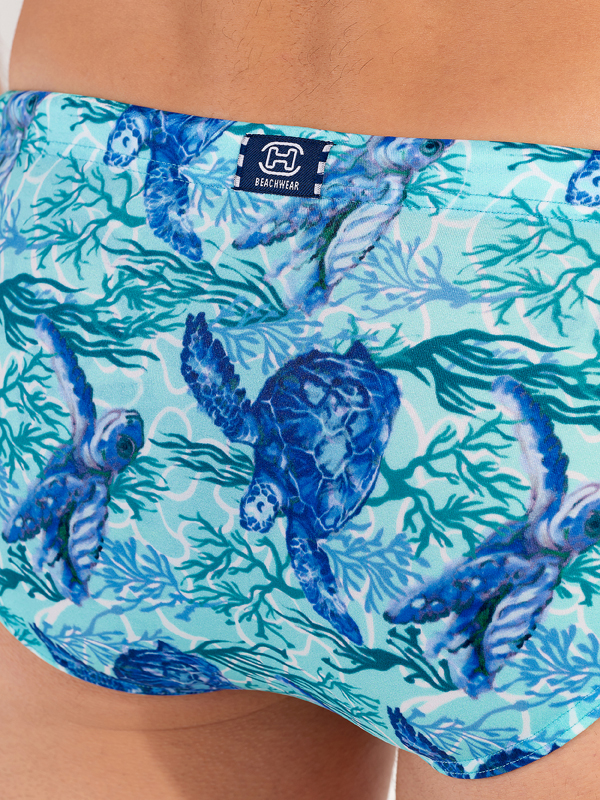 Описание: Мужские пляжные плавки-брифы от HOM в элегантном спортивном стиле с синими фигурками морских черепашек на бирюзовом фоне.