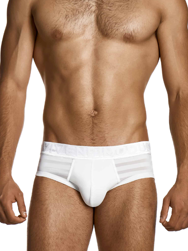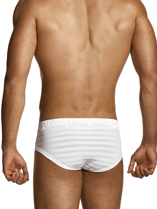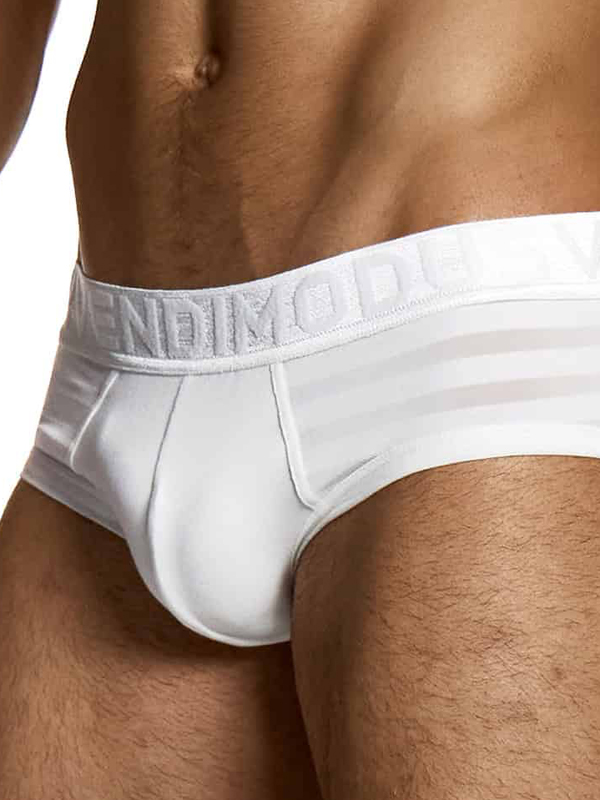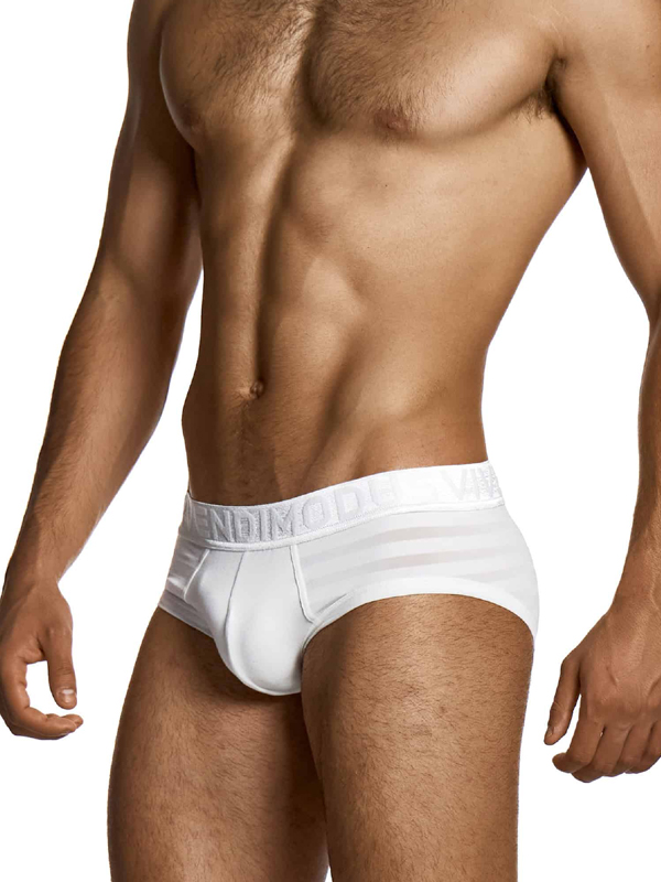Описание: Мужские трусы-брифы белого цвета в ретро-классическом стиле от греческого бренда «Modus Vivendi» из мягкого жаккардового хлопкового материала, в котором чередуются сплошные и полупрозрачные горизонтальные полосы.